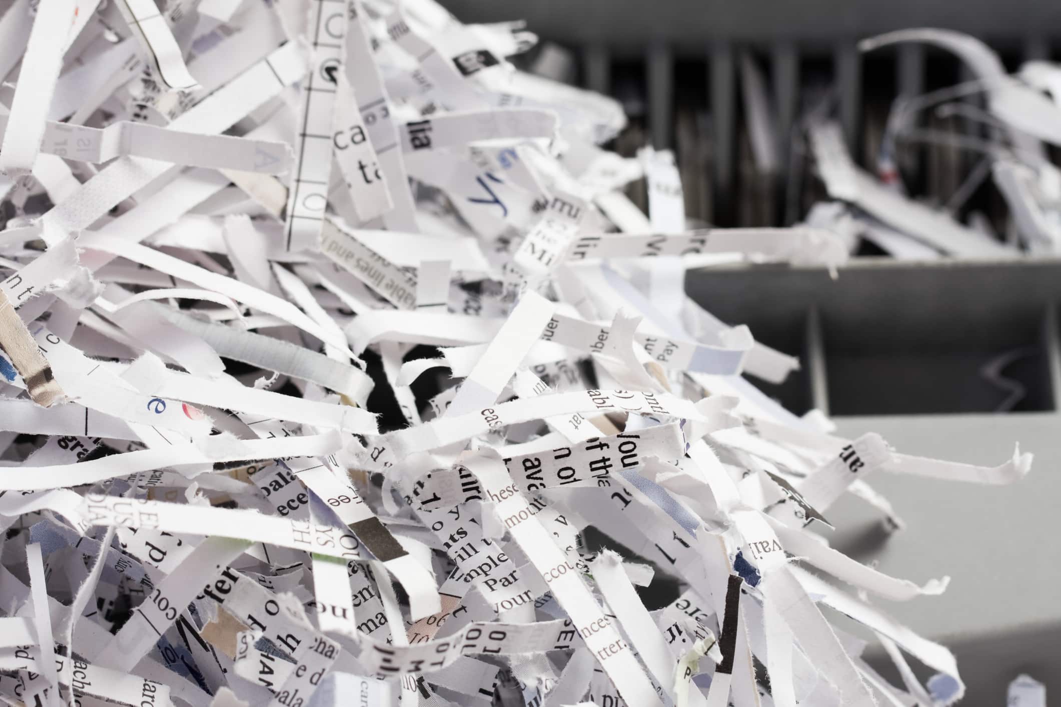 Close up image of a pile of shredded paper documents in front of a paper shredder.