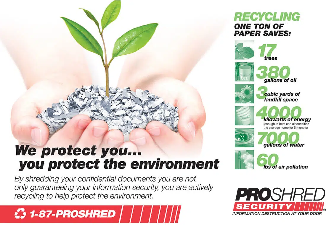 With our certified document destruction, not only are all your documents completely destroyed on-site, 100% of the material is recycled and eventually made into other paper products. Recycling is our way to give back to our communities.